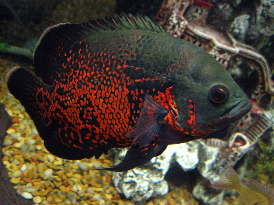 Одной из самых больших рыб, содержащихся в аквариуме, является астронотус, распространенный в бассейне Амазонки. Но сейчас этот вид разводят и в Азии, особенно он популярен в Таиланде. Астронотус также известен под другими названиями: «водный буйвол», «павлиний глаз», «оскар». Общая окраска может быть серой, коричневой и даже черной, по которой разбросаны желтые пятна. Хвостовой плавник украшен черным пятном с оранжевой каймой, похожим на глаз. У аквариумистов наиболее популярна искусственно выведенная форма с красным телом и белыми плавниками. Павлиний глаз очень кроткий питомец. Он может разрешить погладить себя, но почувствовав опасность, способен и укусить своими мелкими острыми зубами. Быстро привыкает к человеку и может кормиться с рук. При создании хороших условий астронотус к четвертому году жизни достигает своих максимальных размеров —35 см.