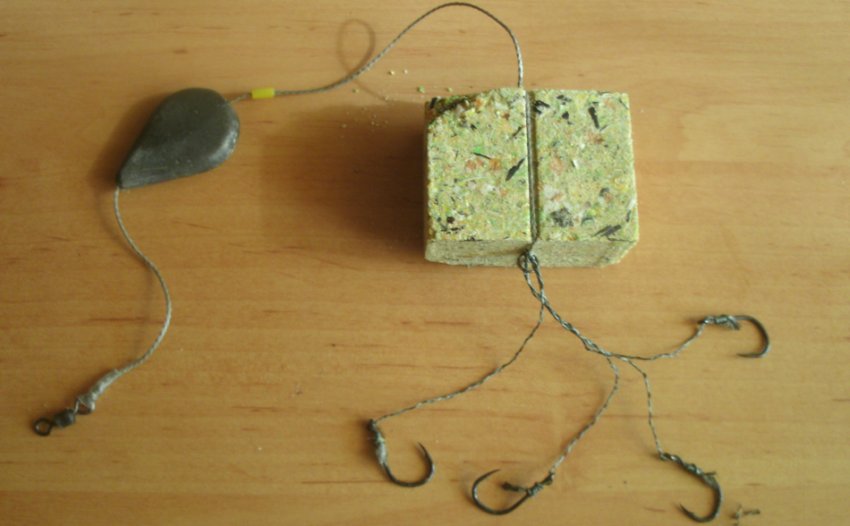 После того как кормушка попадает на дно, сазан всасывает её вместе со спрятанными в ней крючками.
