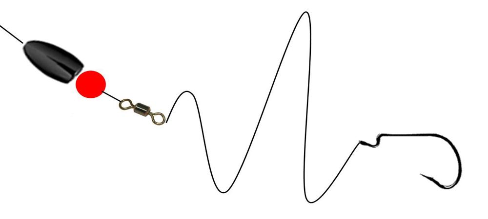 Каролинская оснастка представляет из себя вариант разнесенной оснастки, при котором поводок с крючком и надетой на него приманкой является продолжением основной лески и отделен от нее вертлюжком, бусиной и грузилом.