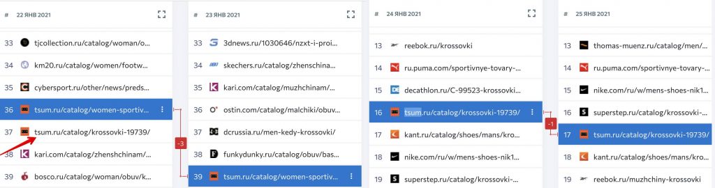 Более наочно увидеть изменения URL в выдаче и вместе с ним позиции сайта можно в разделе «Мониторинг ТОП-100» модуля «Мои конкуренты». Если у сайта есть проблема с каннибилизацией, вы это сразу заметите.
