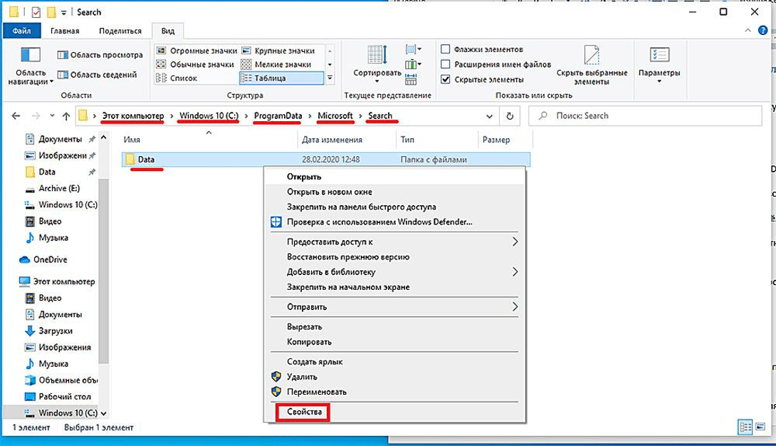 - Открыть «Проводник», перейти по пути: «C:\ProgramData\Microsoft\Search\Data».