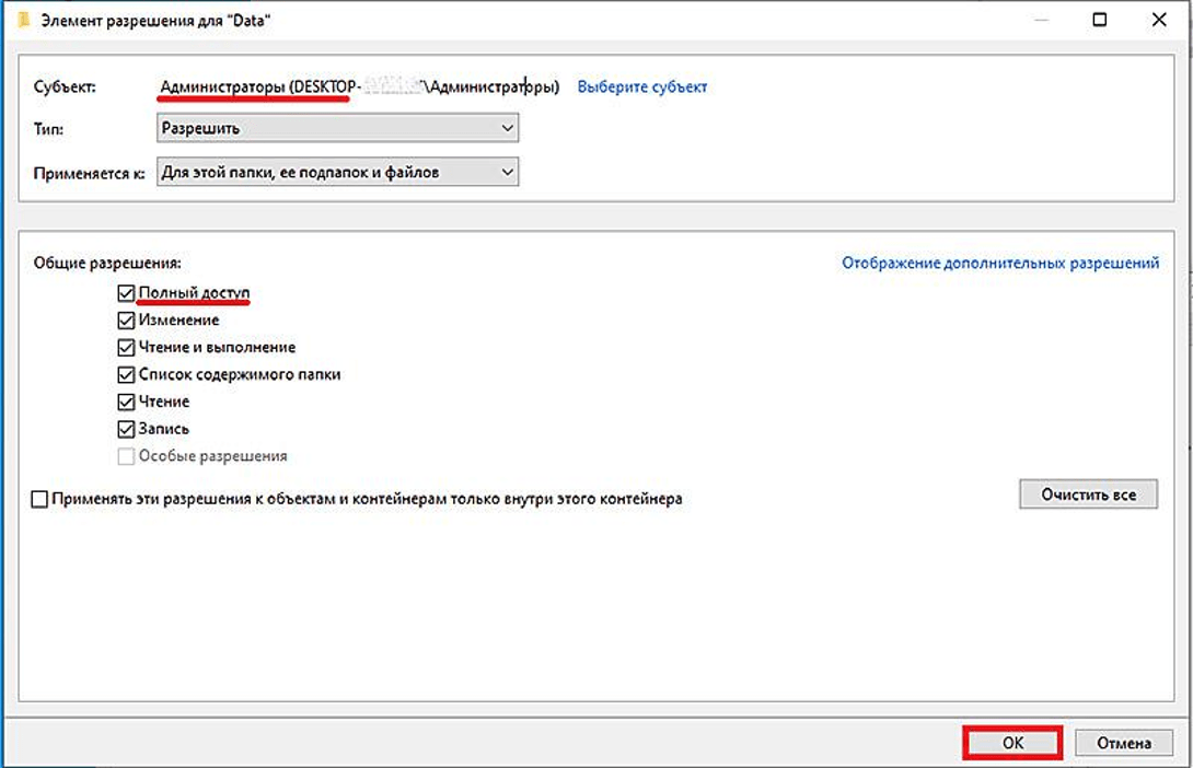 - Отметить маркером «Полный доступ», нажать «Ok».
