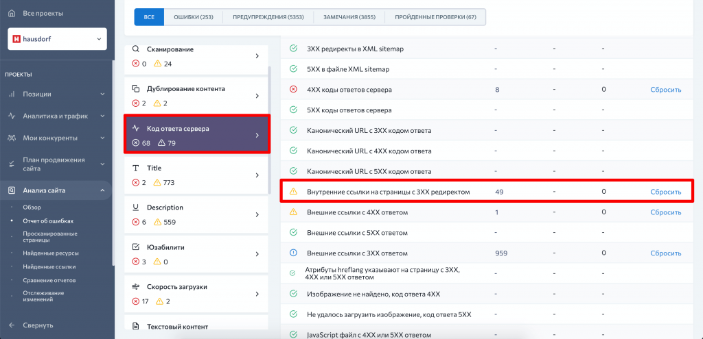 Удалив страницу-дубль, нужно настроить с нее 301 редирект на основную страницу. После этого рекомендуется еще раз просканировать сайт, чтобы найти внутренние ссылки на удаленную страницу — их нужно заменить на URL-адрес, который вы решили оставить. Список таких ссылок вы найдете в разделе «Код ответа сервера» отчета об ошибках «Анализа сайта».