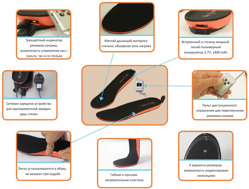 Один из самых известных производителей стелек с электронагревом. Наиболее известны два типа стелек — со встроенным аккумулятором и со сменным. Оба вида имеют пульт управления, с помощью которого можно установить режим или вовсе выключить стельки. Более простой вариант с несъёмной батареей можно купить за 7000 рублей, а вариант с заменяемыми батареями будет стоить уже около 15 000 — 17 000 рублей. Отдельно можно также приобрести и зарядное устройство для авто за 1500 рублей.