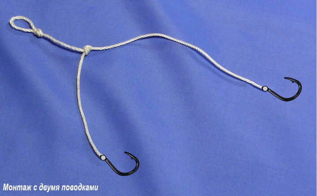 В донке, рассчитанной на ловлю налима, принято использовать два крючка. Поводки с крючками размещают следующим образом:
