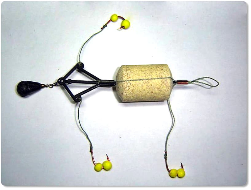 Металлический «тремпель» является основой оснастки на которой как на скелет крепятся все элементы: технопланктон; поводки с крючками, на которые насажен пенопласт. Вся конструкция крепится к основной леске.