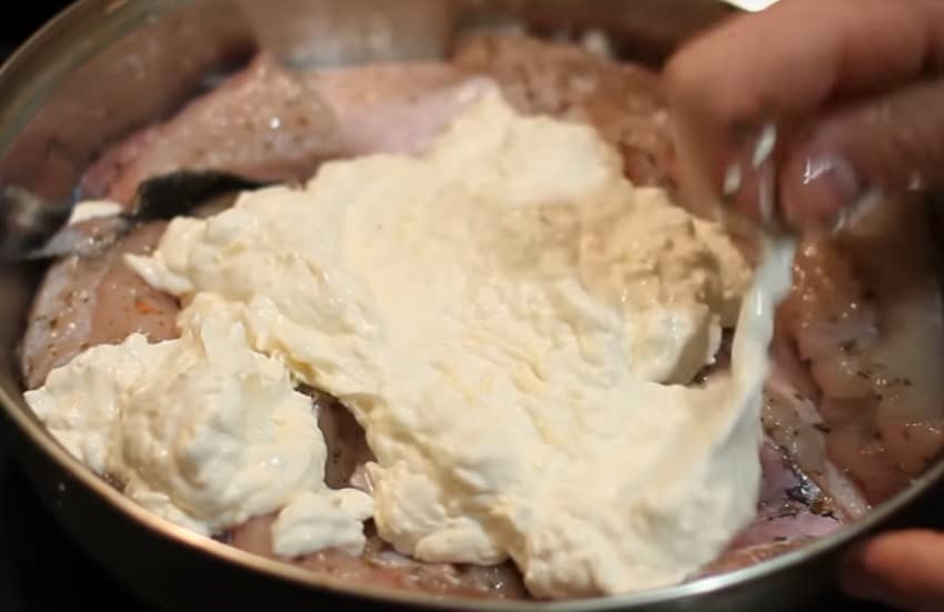 - Натрите майонезным соусом снаружи и изнутри. Маринуйте четверть часа.