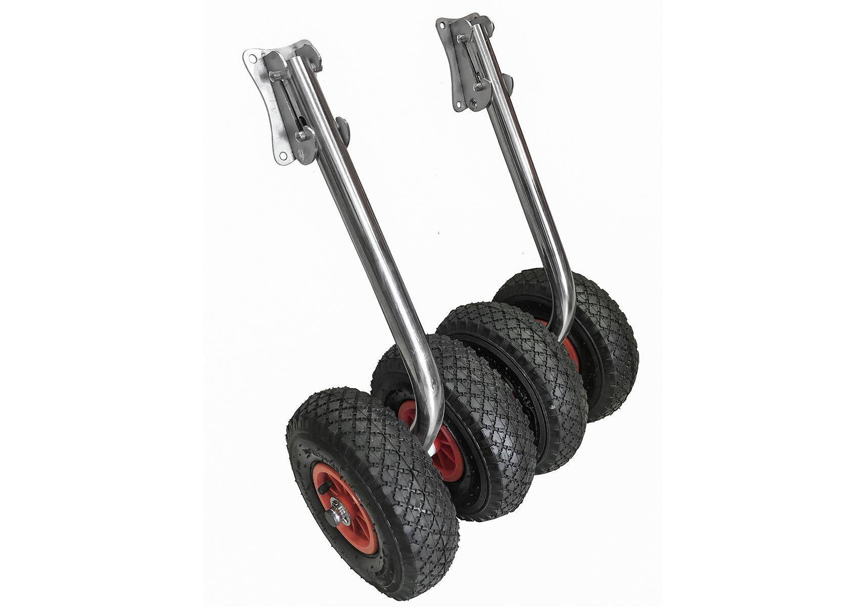 Складные или откидные колеса изначально предполагают, что их можно мобильно использовать. При необходимости передвижения по суше они на специальном креплении откидываются и упираются в землю, а при погружении в воду вертикально поднимаются, не препятствуя свободном плаванию.