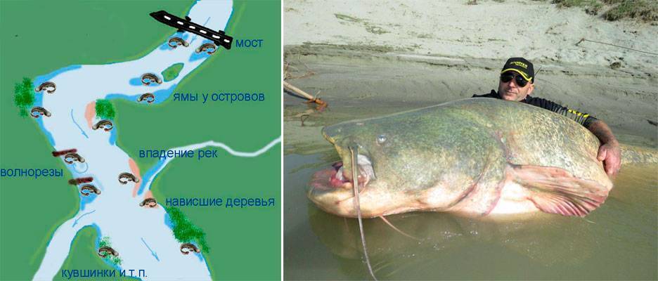 Выбирая место стоянки сома, рекомендуется некоторое время в тишине понаблюдать за водоёмом. Стоит делать ставки на участки водоёма с наличием своеобразных воронок и периодических всплесков воды. Именно этими особенностями поведения и выдаёт себя гигантский хищник.
