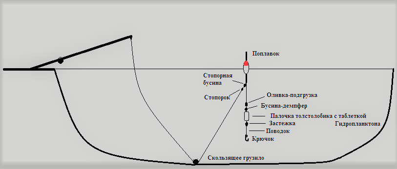Эту оснастку можно успешно применять в безветренную погоду без скользящего груза. На нее обычно ставят поплавки большого размера, чтобы удержать груз от 50 г.
