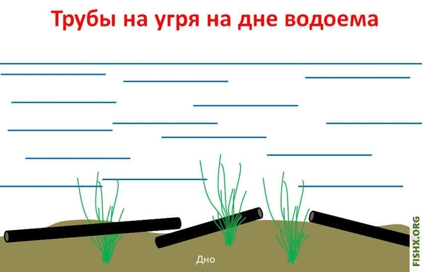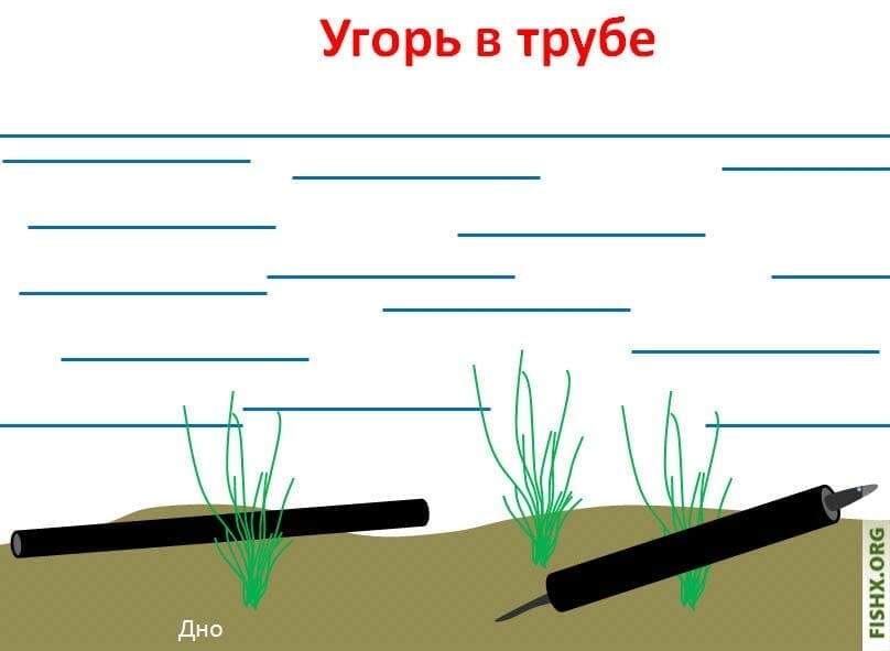 Спустя 1-2 суток, человек подходит к трубе, зажимает её с двух сторон руками и вытаскивает на берег. В 80% случаев в трубе сидел угорь.