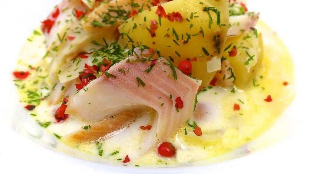 - В закипевшую воду всыпьте картофель и проварите его 20 мин. Положите рыбу, влейте сливки. Держите на плите еще 10 мин.