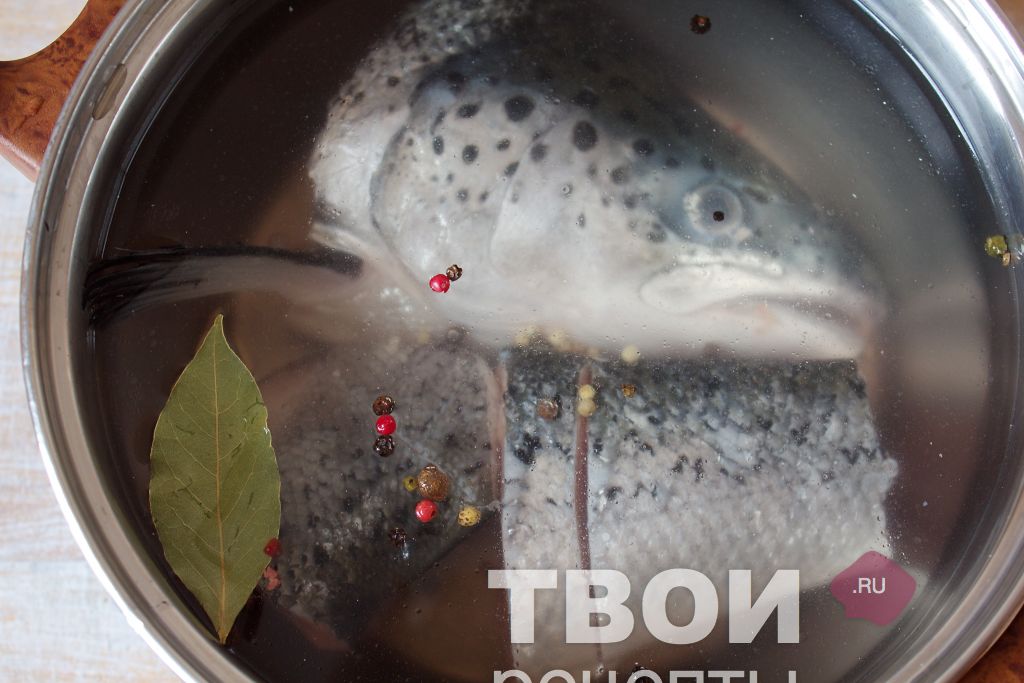 - В кастрюлю положить голову и хвост лосося общим весом около 700 г. Залить рыбу водой и поставить кастрюлю на огонь.