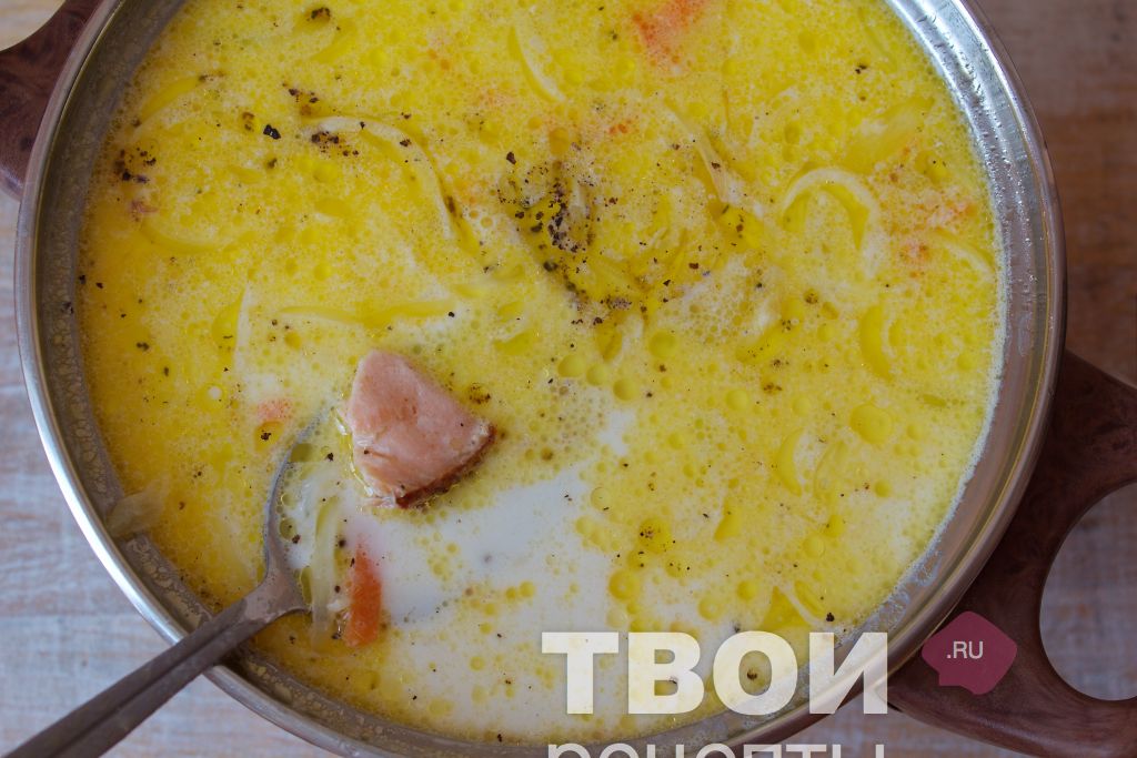 - Добавить в бульон картофель кубиками (5 шт.), а через 10 минут после закипания влить в суп сливки жирностью 22-33% (1 ст.). Следом положить плавленый сыр из банки (200 г) и кусочки лосося, отделенные от головы и хвоста.