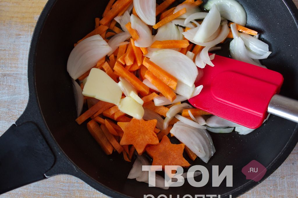 Лук и морковь очистите, порежьте соломкой, затем обжарьте в подсолнечном масле до золотистой корочки.