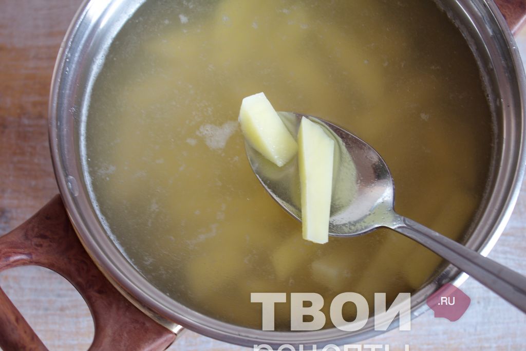Картошка с морковкой готовы, я достаю из кастрюли несколько крупных кусочков картошки, разминаю их до пюре, и отправляю обратно в кастрюлю. Таким образом я загущаю суп без муки.