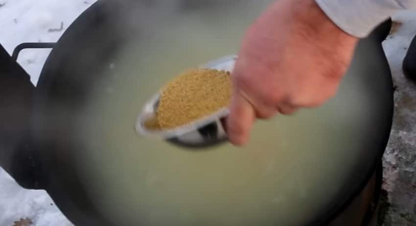 - Взять кастрюлю значительно большего размера, налить в нее оставшуюся половинку воды, добавить нужное количество соли и поставить на огонь.