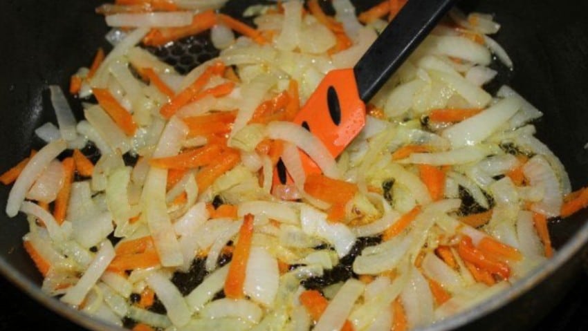5. Вторую луковицу нашинкуйте полукольцами, морковь нарежьте тонкой соломкой. Отправьте в разогретую сковороду с растительным маслом и жарьте, постоянно помешивая, до готовности.