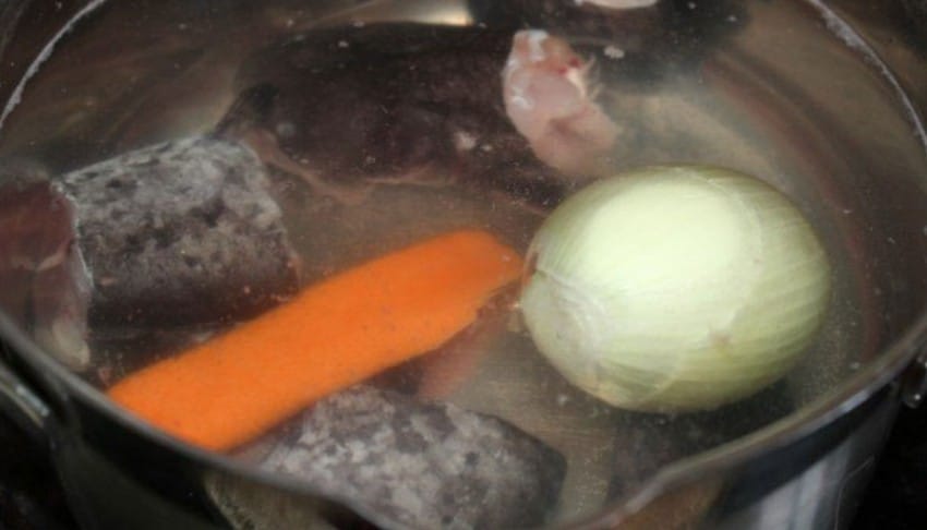 1. Вскипятите в котелке или кастрюле воду, посолите её и положите картофель, разрезанный на 4 — 6 частей (в зависимости от величины). Туда же положите нарезанный соломкой корень петрушки и морковь, порезанную крупными кольцами и нашинкованный лук. Добавьте рыбьи хвосты и головы.