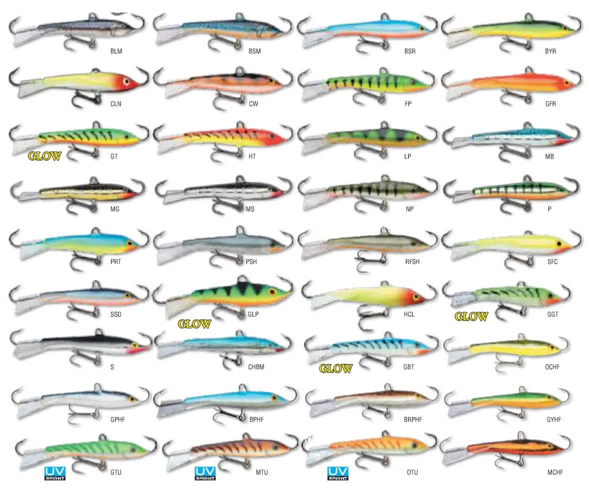 Весь ассортимент продукции собран в специальной таблице, которую можно найти в каталоге цвета балансиров Рапала. Покупая приманку, лучше всего предварительно узнать её обозначение. Существует множество расцветок, к примеру, полосатые зелёно-красные HT или оранжевые MTU. Кроме них, есть голубые GBT, серые NP или тёмно-огненные на светлом OUT.