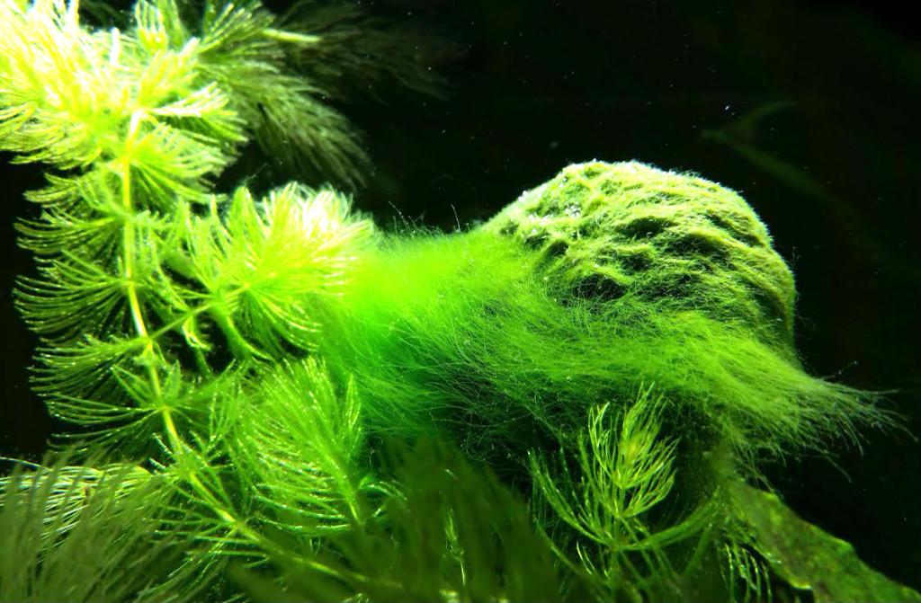 Кладофора. Имеет вид кустиков, которые прикрепляются к поверхности, состоит из жестких и прочных ветвящихся нитей. Чаще всего заносится в резервуар случайно на корнях или листьях растений. У этой водоросли условия обитания близки к условиям жизни растений. Она устойчива к различным химическим средствам.