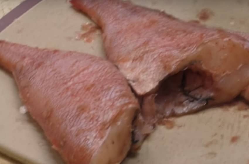- Удалите голову, уберите внутренности, срежьте плавники, хвост. Проверьте, не осталось ли внутри черной пленки, её необходимо обязательно убрать.