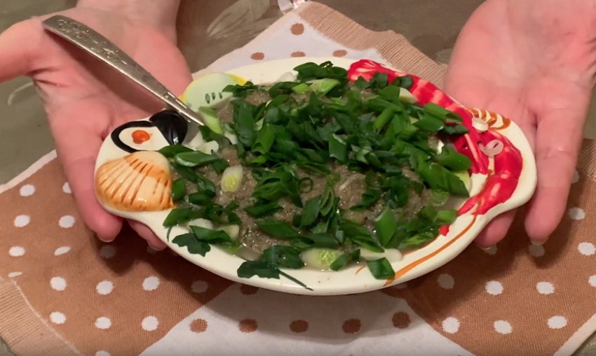 Пока вода закипает, перепустите икру через мясорубку, отделяя оставшуюся часть плёнки (остаётся на ноже и насадке прибора).