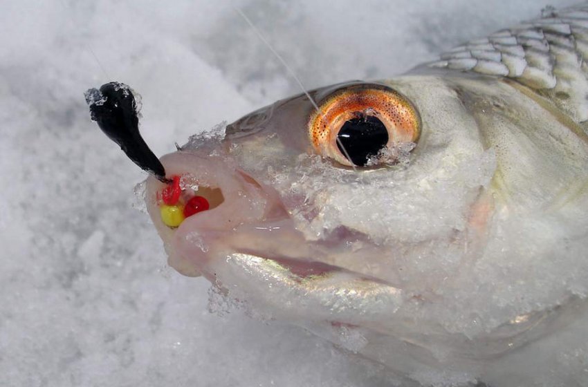 Часто при этом она цепляется за самый краешек губы. Если тянуть трофей к лунке слишком быстро, можно легко вырвать приманку из его рта. Вываживать рыбу надо в меру напористо и при этом мягко.