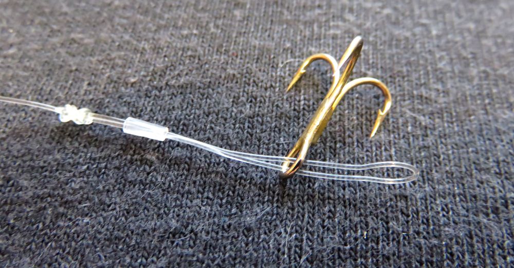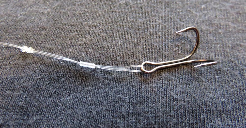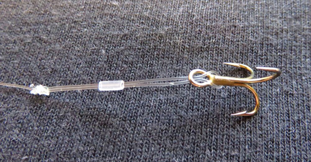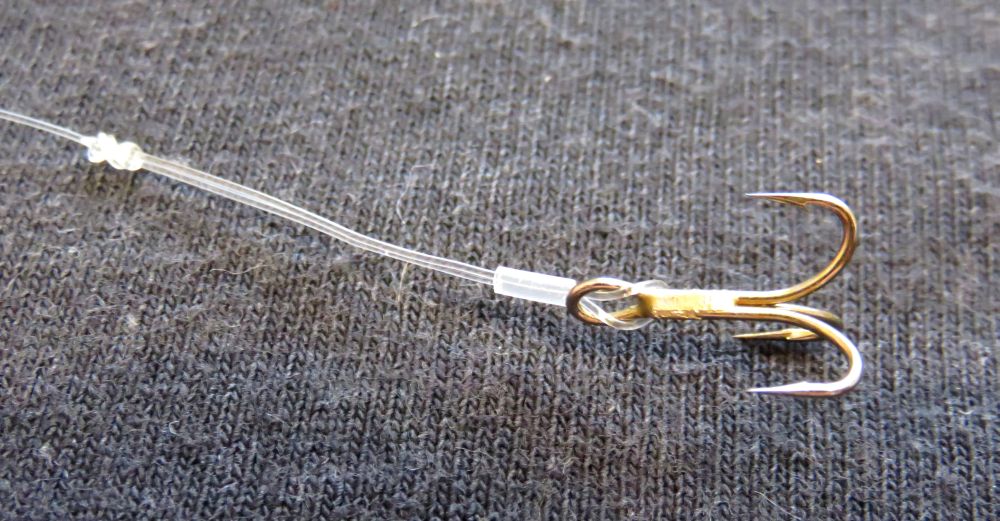 Но вернемся к дальнейшей сборке. На петлю надеваем отрезок силиконового кембрика длиной около 5 мм и диаметром 0,3 – 0,5 мм (в зависимости от толщины используемого флуорокарбона). Выбираем диаметр трубочки таким образом, чтобы её кусочек передвигался по петле с приличным усилием. Далее оснащаем поводок двойником, поджимая его основание отрезком силикона Stonfo. Либо накидываем хирургическую петлю на тройничок способом петля в петлю, также поджимая его основание резиновой трубочкой (второй этап для тройника – фото 16 – 18).