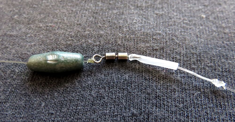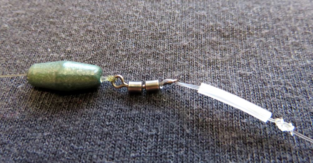 Первый этап – фото 10 – 12. Кусочек силиконового кембрика длиной 10 – 15 мм и диаметром 0,8 – 1 мм (зависит от диаметра используемого флуорокарбона) надеваем на более короткую хирургическую петлю. Затем способом петля в петлю соединяем готовый поводок со сдвоенным вертлюжком (№№ 14 или 16), который привязываем к концу основной лески (шаг 1). Здесь сделаю небольшую оговорку.
