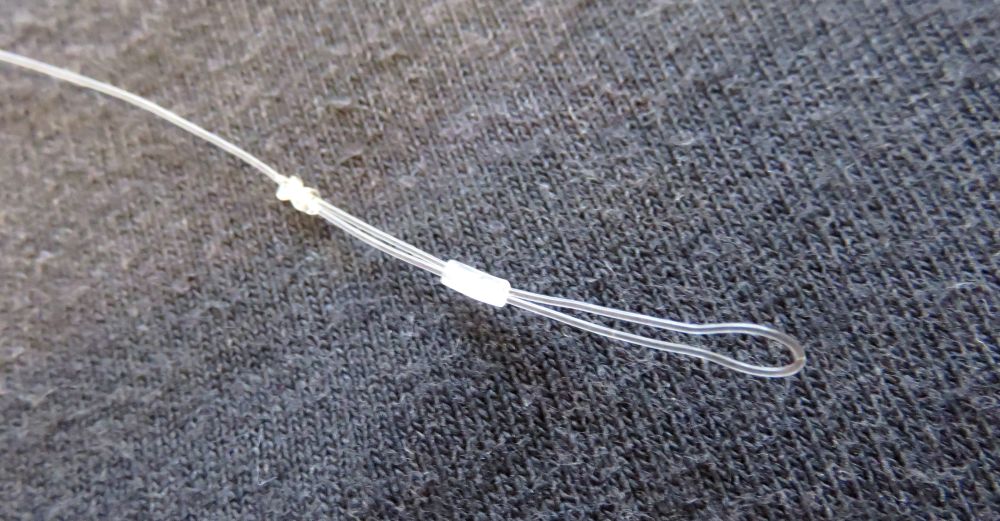 Берем отрезок такой мононити длиной 500 – 600 мм, с одной стороны делаем так называемую «хирургическую петлю» (Surgeon’s Loop) длиной около 20 – 25 мм. Узел затягиваем постепенно, обильно смачивая его водой. Поступаем так во избежание перегрева материала и ухудшения его рабочих характеристик в месте образования узла. С другой стороны отрезка флуорокарбона также вяжем хирургическую петлю, но уже чуть более длинную, около 30 мм. В общих чертах поводок уже готов, приступаем к его сборке.