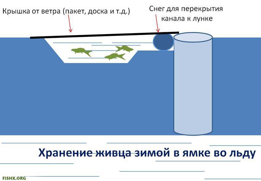 4. Зимой многие рыбаки хранят живца в своеобразной ямке, которую выдалбливают во льду и наполняют водой. Я делаю также, но с тем отличием, что вокруг этой ямки делаю стенку из снега, которая защищает водную поверхность от ветра и более быстрого замерзания. А если есть возможность, можно такую ямку и накрыть сверху тканью, фанеркой, пакетом и т. д. Это и от ветра защитит, да и от некоторых пернатых, которые в некоторых регионов зимой очень активны.